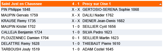 Sans véritable inquiétude, notre équipe ouvrait rapidement le score au 7e échiquier grâce à Rémy D. Damien lâcha prématurément le point au 6e mais la réaction ne se fît pas attendre longtemps par des gains aux 8e et 5e échiquiers. Peu après, Rémy K assurait la nulle à la table 3 et St Just menait alors 3-1. Cependant, la confiance laissait place au doute car à ce moment du match la situation des trois parties encore en jeu n’était pas favorable. Heureusement, un retournement eut lieu sur chaque échiquier. Kristel profita d’une grossière erreur en finale pour marquer le point. St Just menait 4-1 et s’assurait la victoire. Le score resta inchangé après les nulles signées aux deux premières tables.