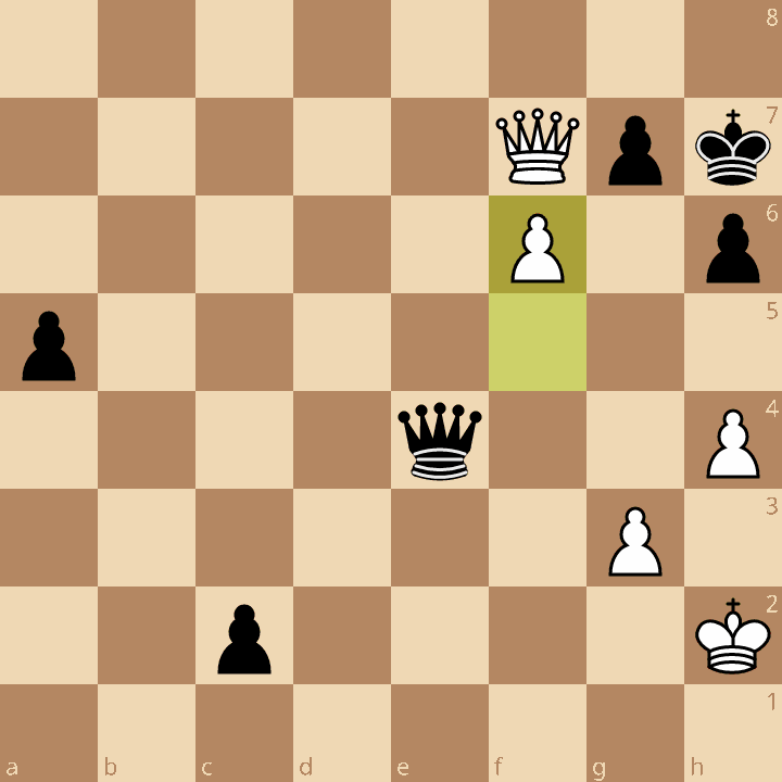 Ici, les noirs ont joué 43…Dh1+?? 44.Rxh1 c1=D+ 45.Rh2 Db2+ 46.Rh3 Dxf6 et la nulle arrive au 60e coup. Le gain s’obtient simplement par 43…De2+ 44.Rh3 Df1+ 45.Rh2 Dxf6 et une 2e dame noire est en vue.