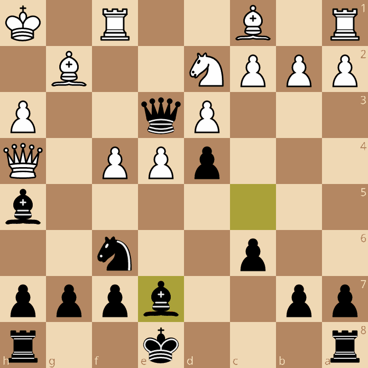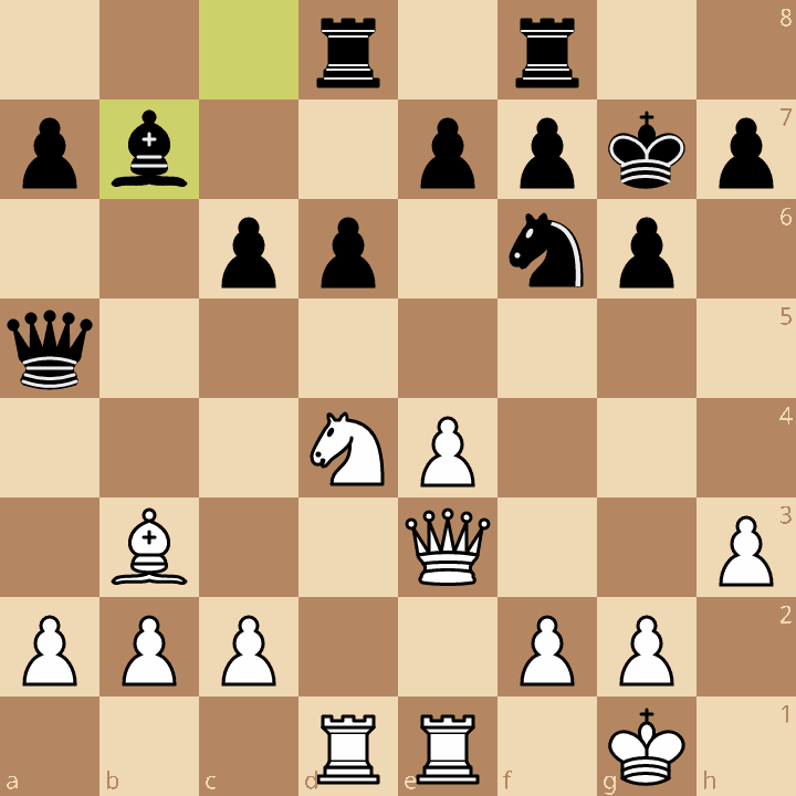 Au 4e échiquier avec les blancs, Eric joue un début classique et obtient une position convenable. Après de nombreuses manœuvres de pièces, il prend l’initiative à son compte. Eric saisit l’occasion de placer un sacrifice de deux pièces mineures pour gagner une tour et deux pions. En réalité, la combinaison était plus forte que supposée car le gain était à portée de main (diag).