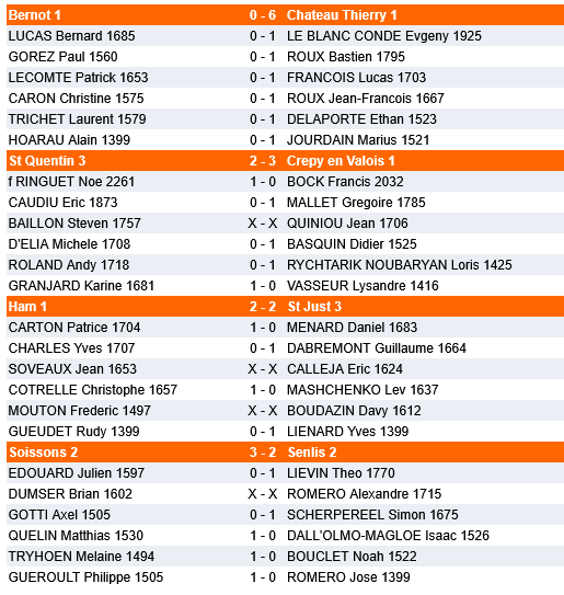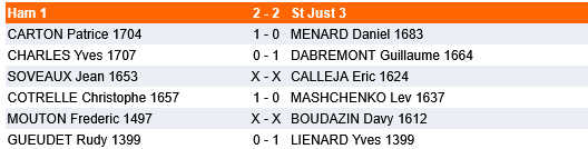 L’équipe de St Just abordait cette dernière ronde avec sérénité puisque le maintien était assuré quel que soit le résultat du match qui l’opposait à Ham. Pour le club adverse, le maintien était également acquis. Au point de vue élo, le duel s’annonçait équilibré. Après plusieurs rebondissements ici et là, les deux équipes se séparaient finalement sur un score égal et leur position respective au classement restaient inchangées.