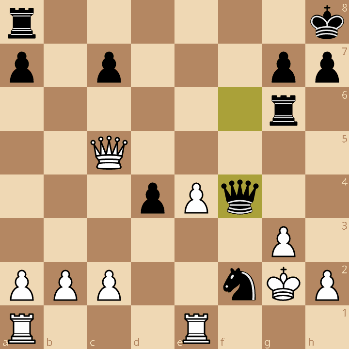 Ici, 25.Df5 était impératif avec 25…Dxf5 26.exf5 et ensuite 27.Rxf2 relançant complètement les blancs. Lev a joué 25.Dxd4? et son roi s’est fait mater peu après